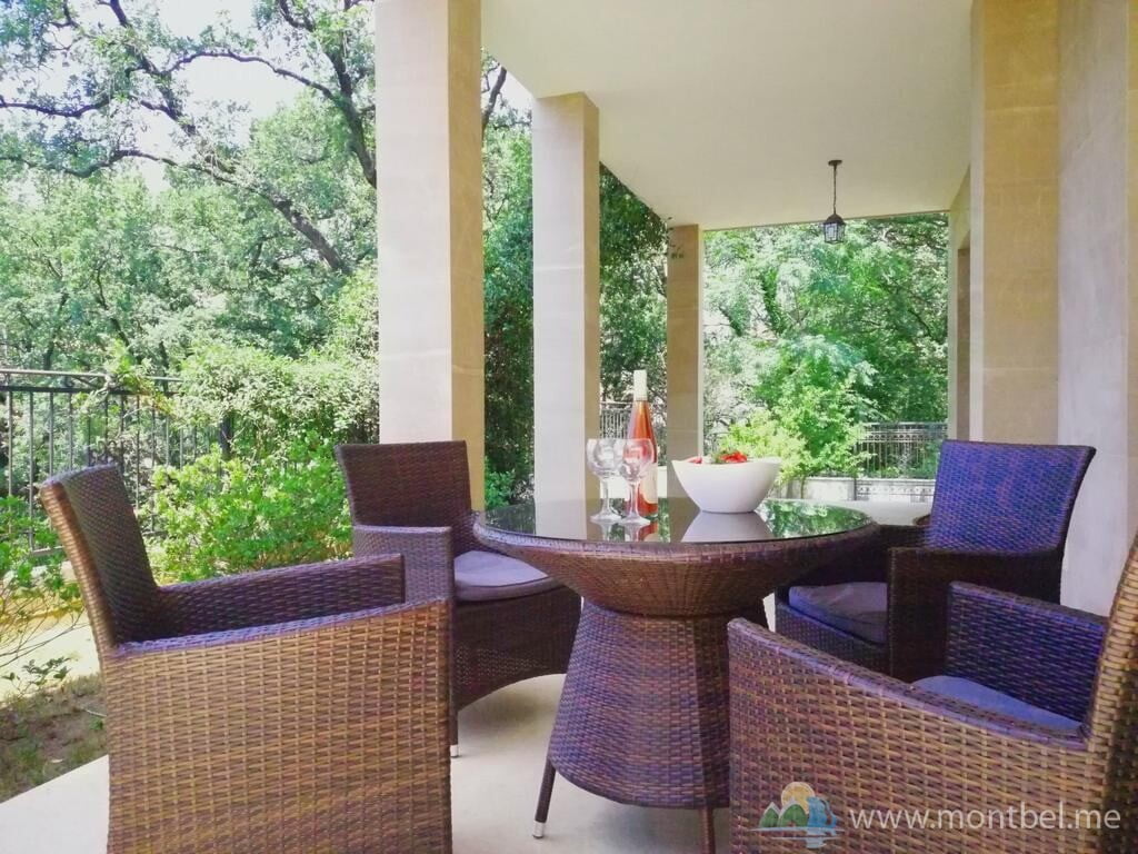Вилла обставлена современной мебелью из натурального дерева, гараж, бассейн, патио, терраса.